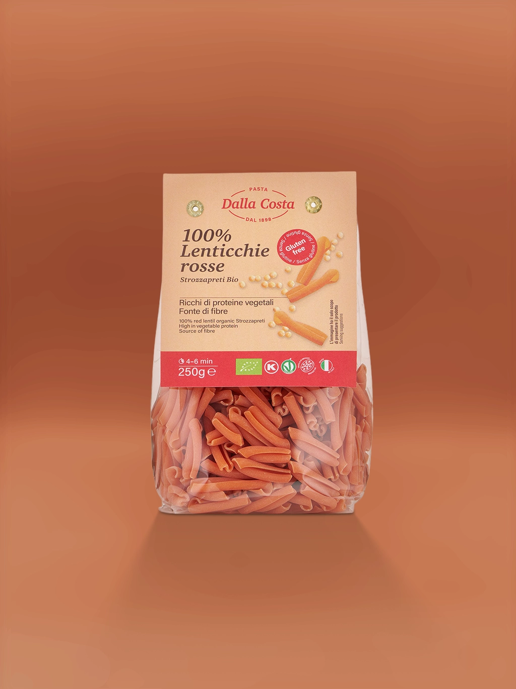 Dalla Costa Organic Gluten Free Lenticchie Rosse is pasta made fully from organic red lentils. Naturally high in protein and fiber to support satiety and muscle maintenance. Lower in carbohydrates than wheat pasta. Suitable for gluten-free and plant-based diets. Single-ingredient clean formulation.