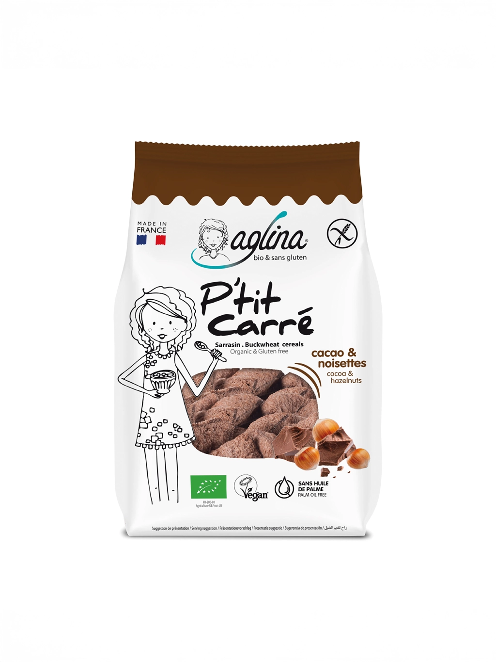 Start your day with a crunchy, wholesome bowl of Aglina P’tit Carré Cacao & Hazelnuts, a delicious organic buckwheat cereal packed with cocoa and hazelnut flavor. These bite-sized squares are gluten-free and vegan, perfect for the whole family.