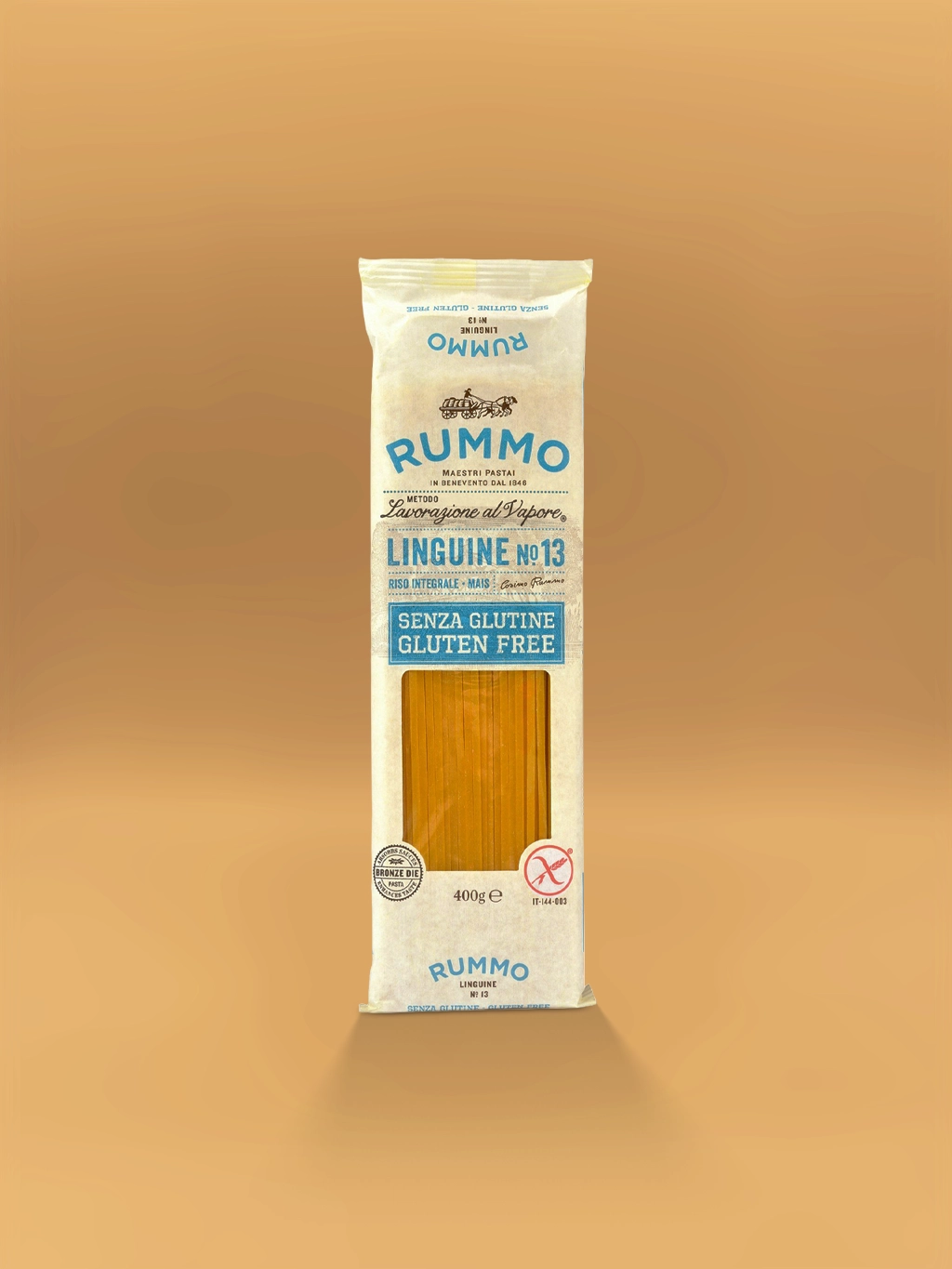 Rummo Linguine No 13 Gluten Free pasta is crafted from a blend of brown rice (36%), yellow corn (32.5%), white corn (20%), raw rice (8%), and potato starch (3%). It uses mono- and diglycerides of fatty acids (vegetable origin) as an emulsifier. It is a gluten-free and GMO-free product.